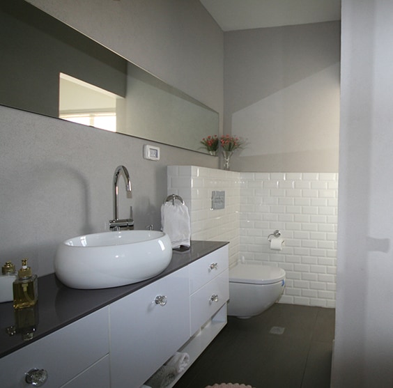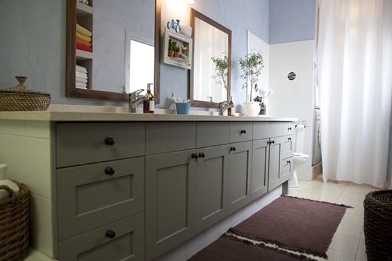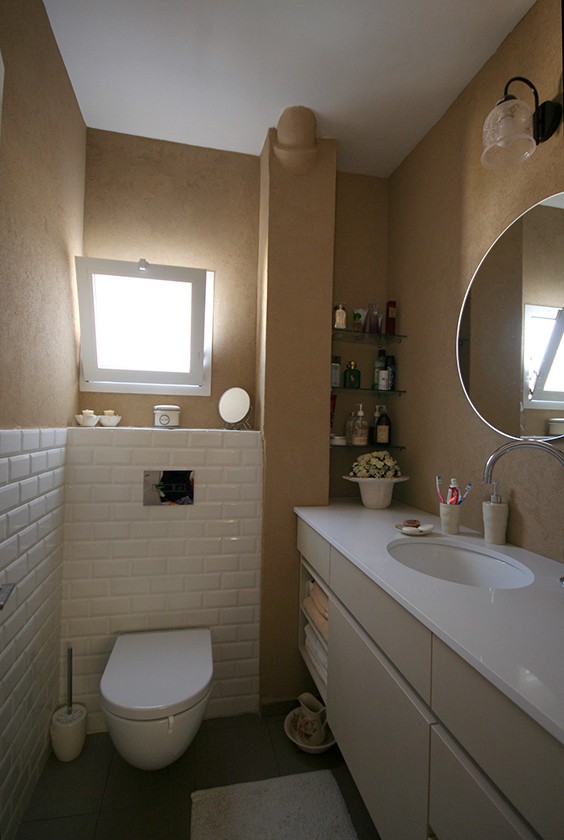 אחרי השיפוץ- ארונות הרחצה נצבעו מחדש, יושם טיח נושם ורגוע