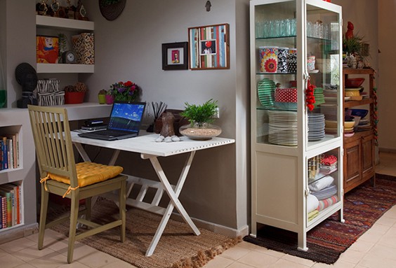 הקיר הנמוך משלב שתי עמדות בו זמנית- דלפק אכילה ועמדת עבודה.