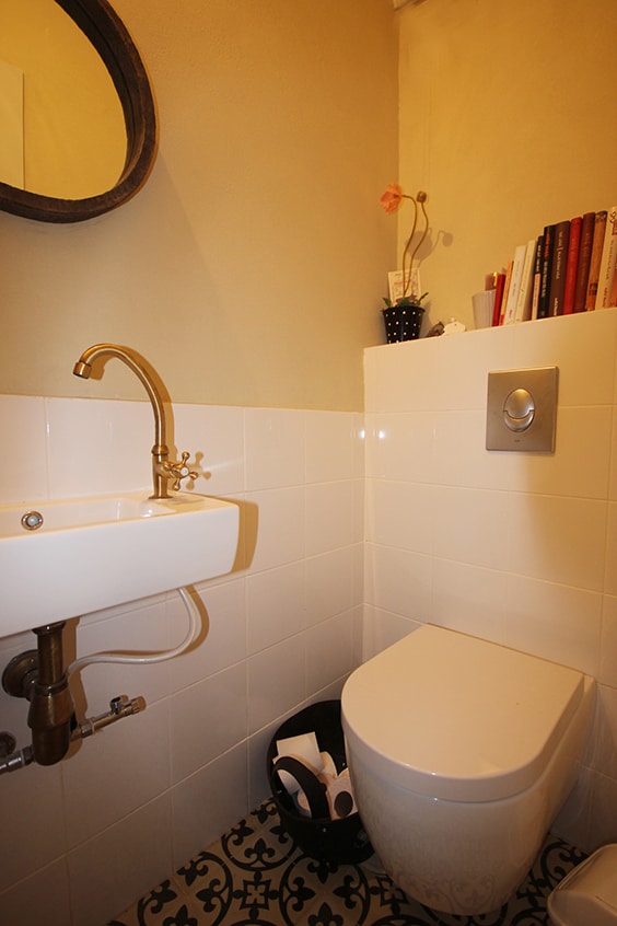 לפני השיפוץ- כלים סניטריים ישנים וחיפוי גבוה המחשיך את החלל