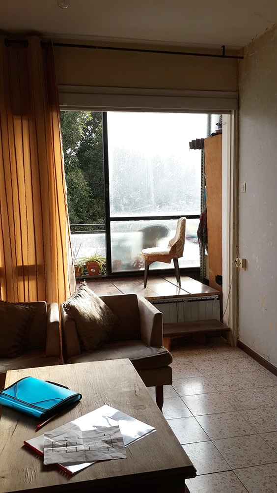 לפני השיפוץ- סלון במבנה ישן עם מרפסת מוגבהת באופן יזום ופשטני
