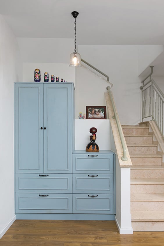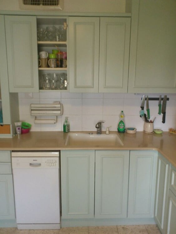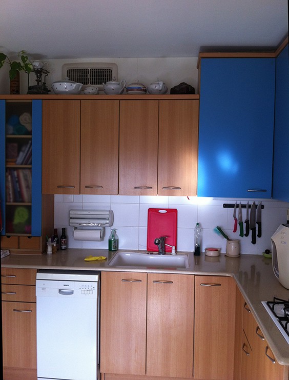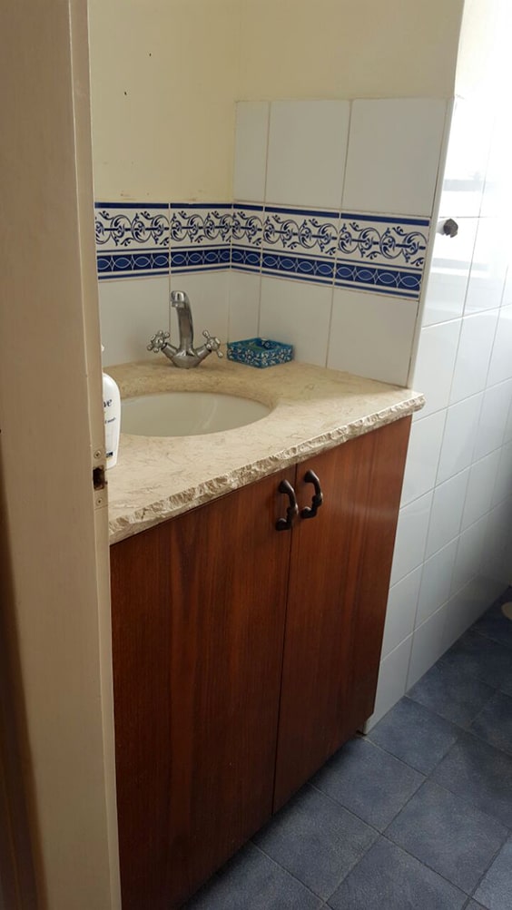 לפני השיפוץ- ריצוף כחול וארון כהה
