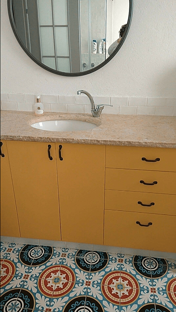 אחרי שיפוץ– נבחרה רצפה משמחת וארון ישן נצבע עצמאית בגוון תואם